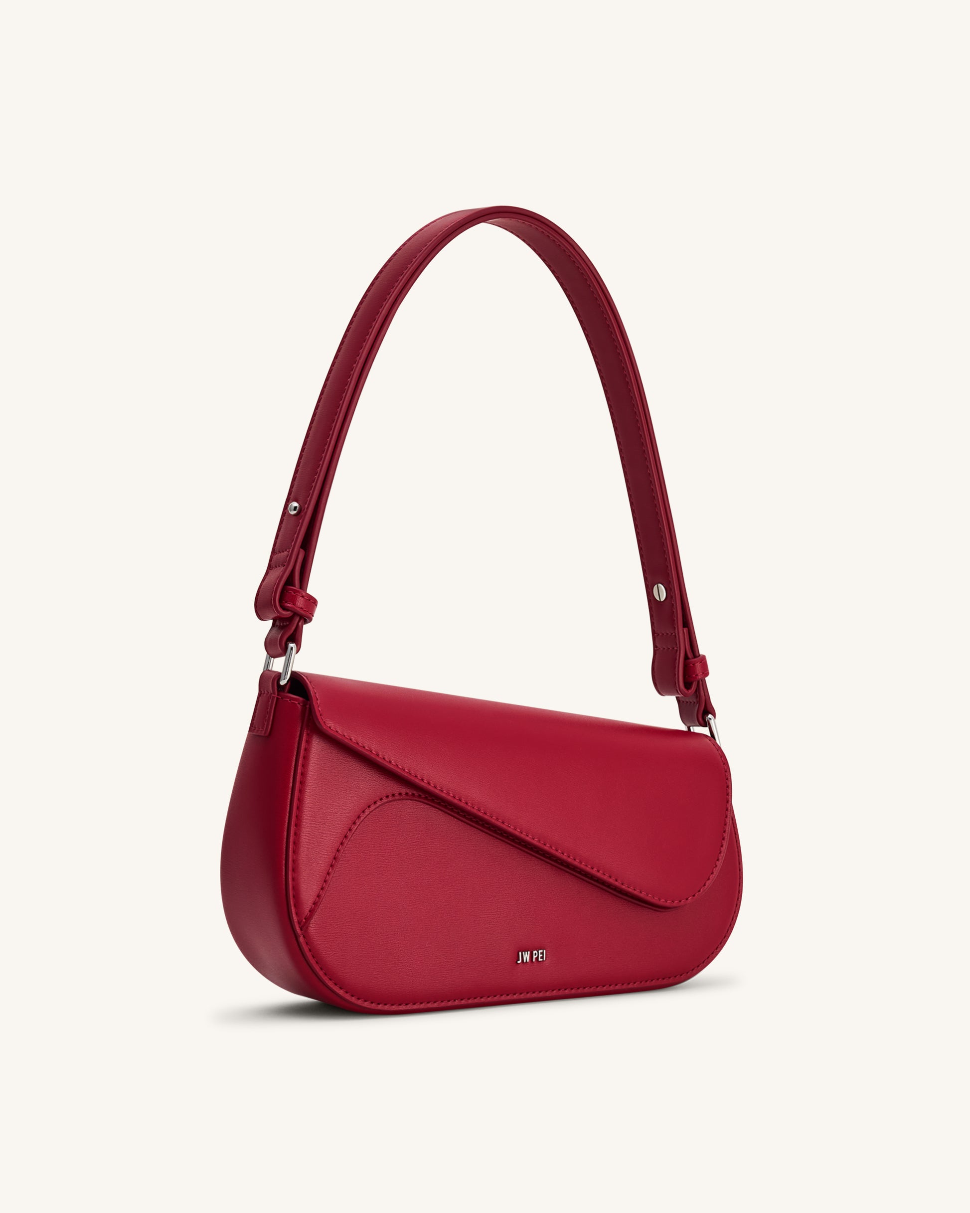 Sac en cuir vegan rouge élégant avec une silhouette minimaliste. La sangle unique réglable offre une grande flexibilité. Les accessoires argentés complètent la couleur audacieuse. Convient pour le jour ou la nuit.