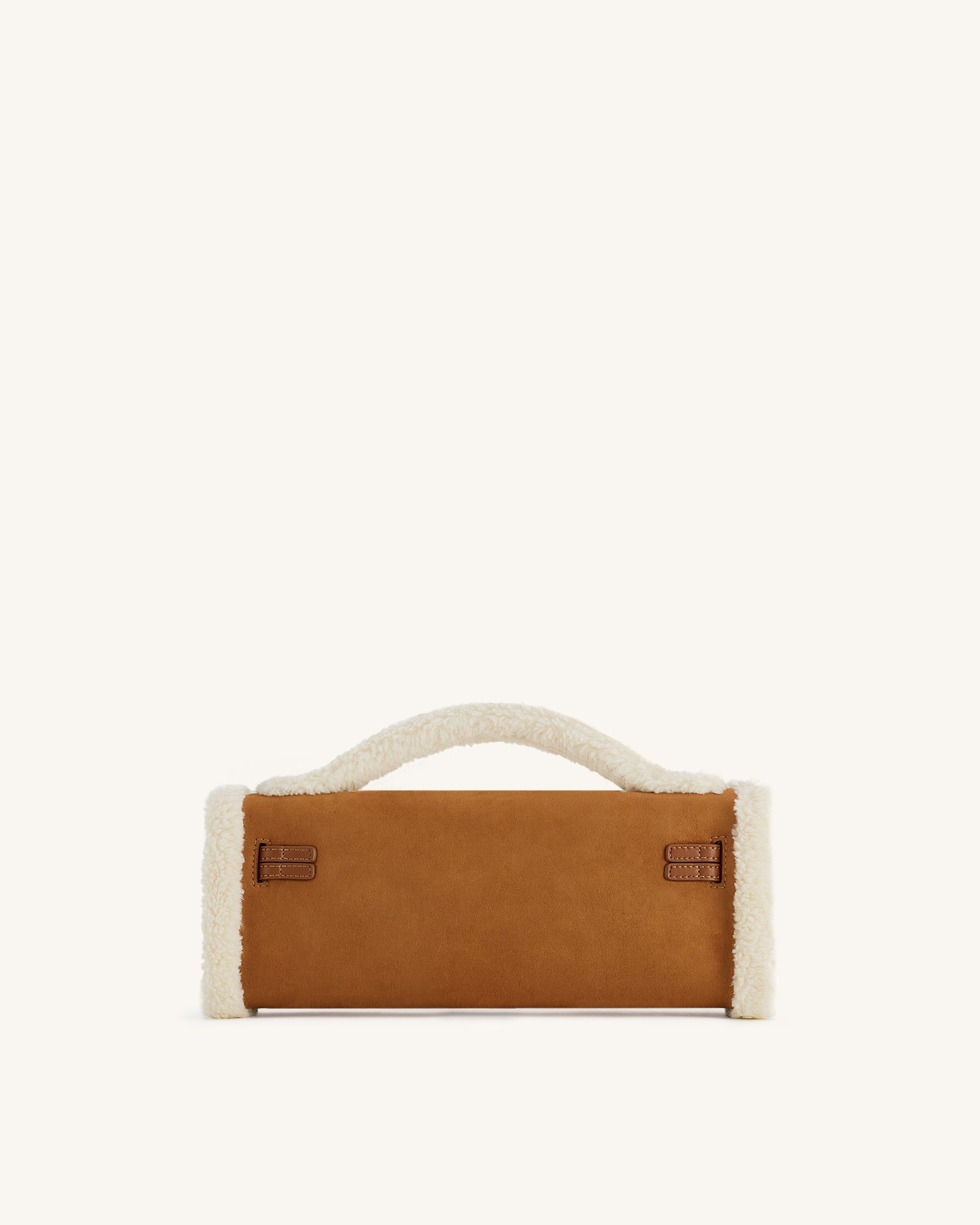 Un sac structuré rectangulaire à anse supérieure en daim synthétique marron avec garniture en peau lainée. Fini avec une quincaillerie dorée et une fermeture à tourniquet sécurisée. Compact, confortable et chic.