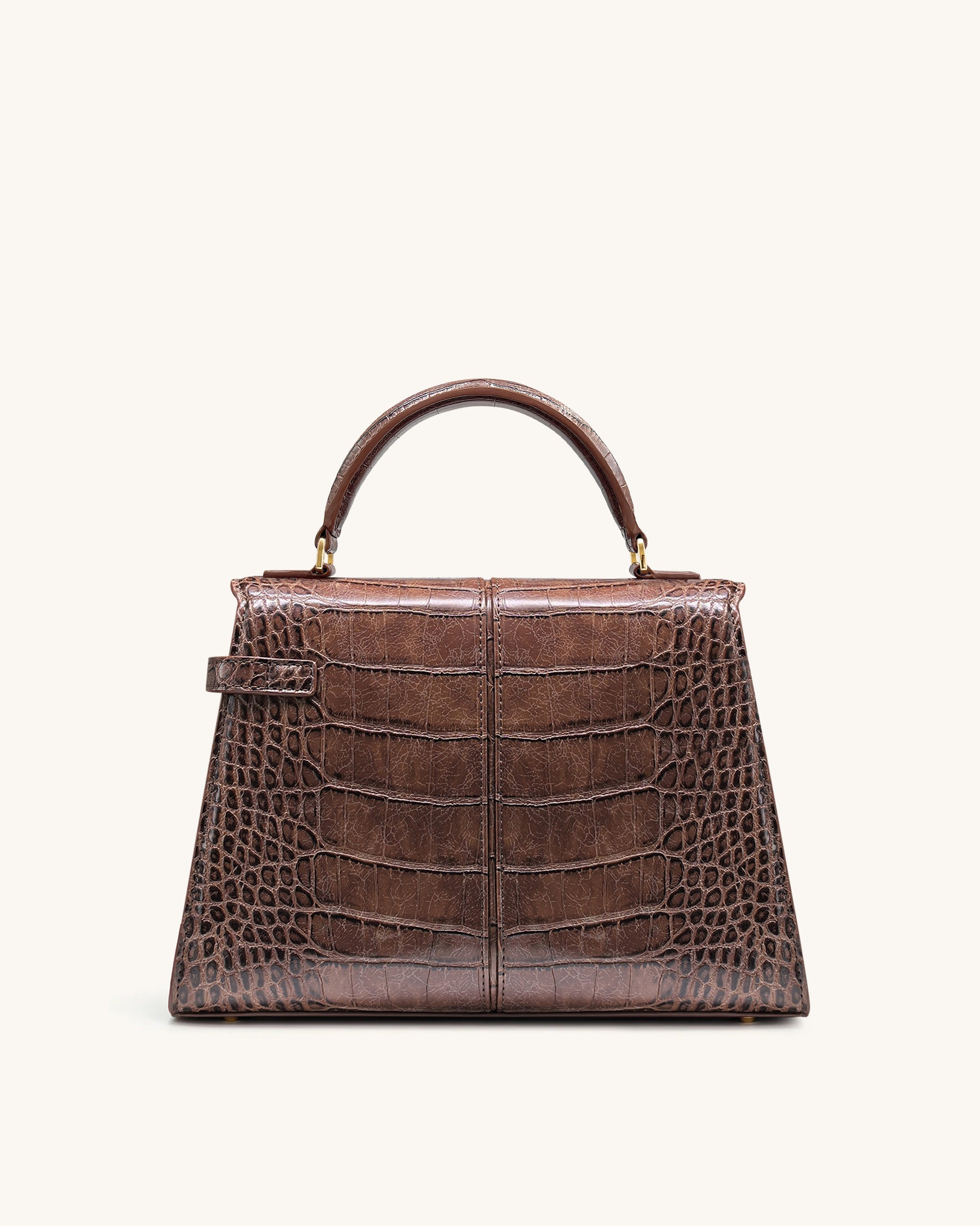 Structuré et élégant, ce sac à main présente un extérieur en cuir vegan à motif croco brillant. Accessoires dorés et fermeture à verrou tournant sécurisée pour une touche raffinée. Poignée unique et options de port polyvalentes.
