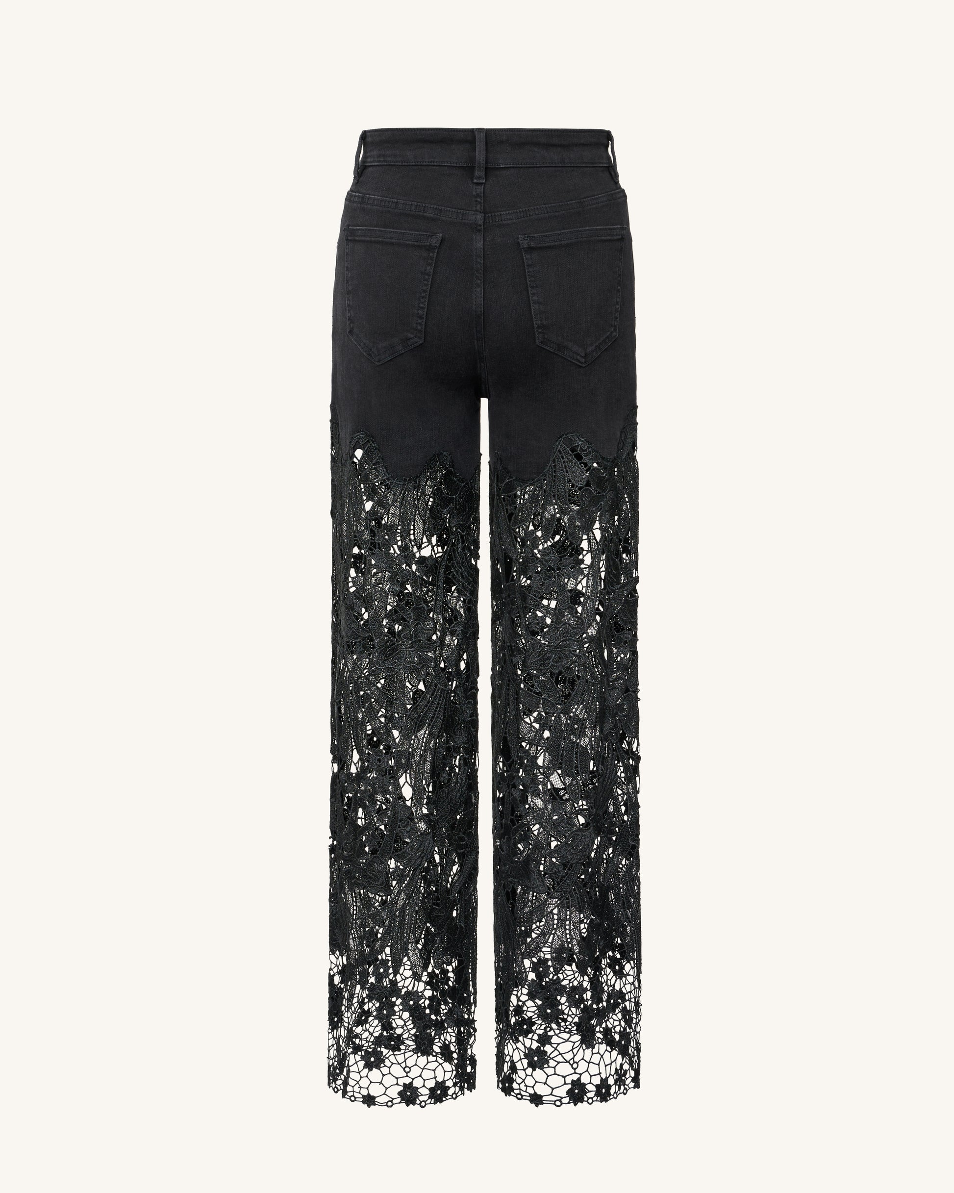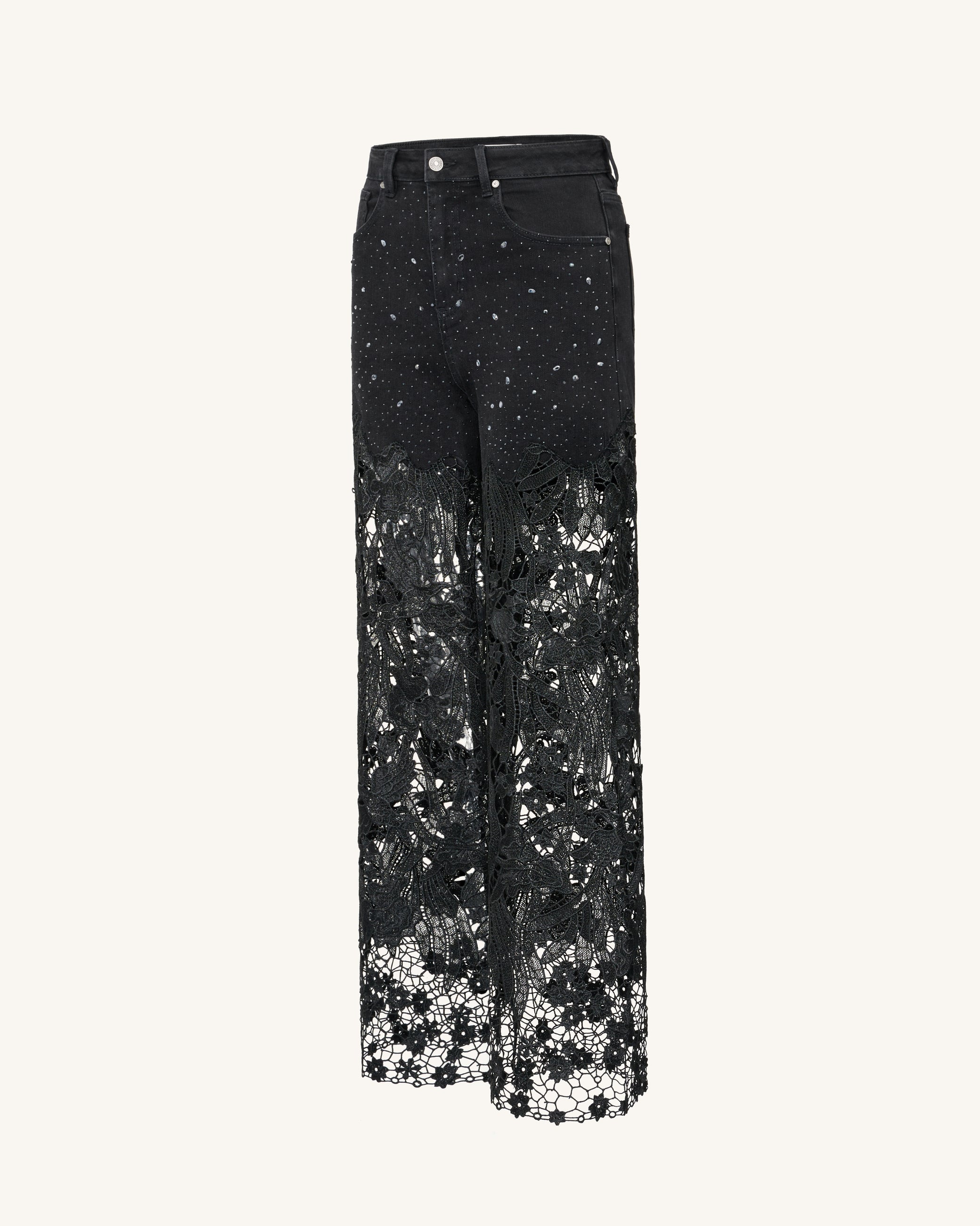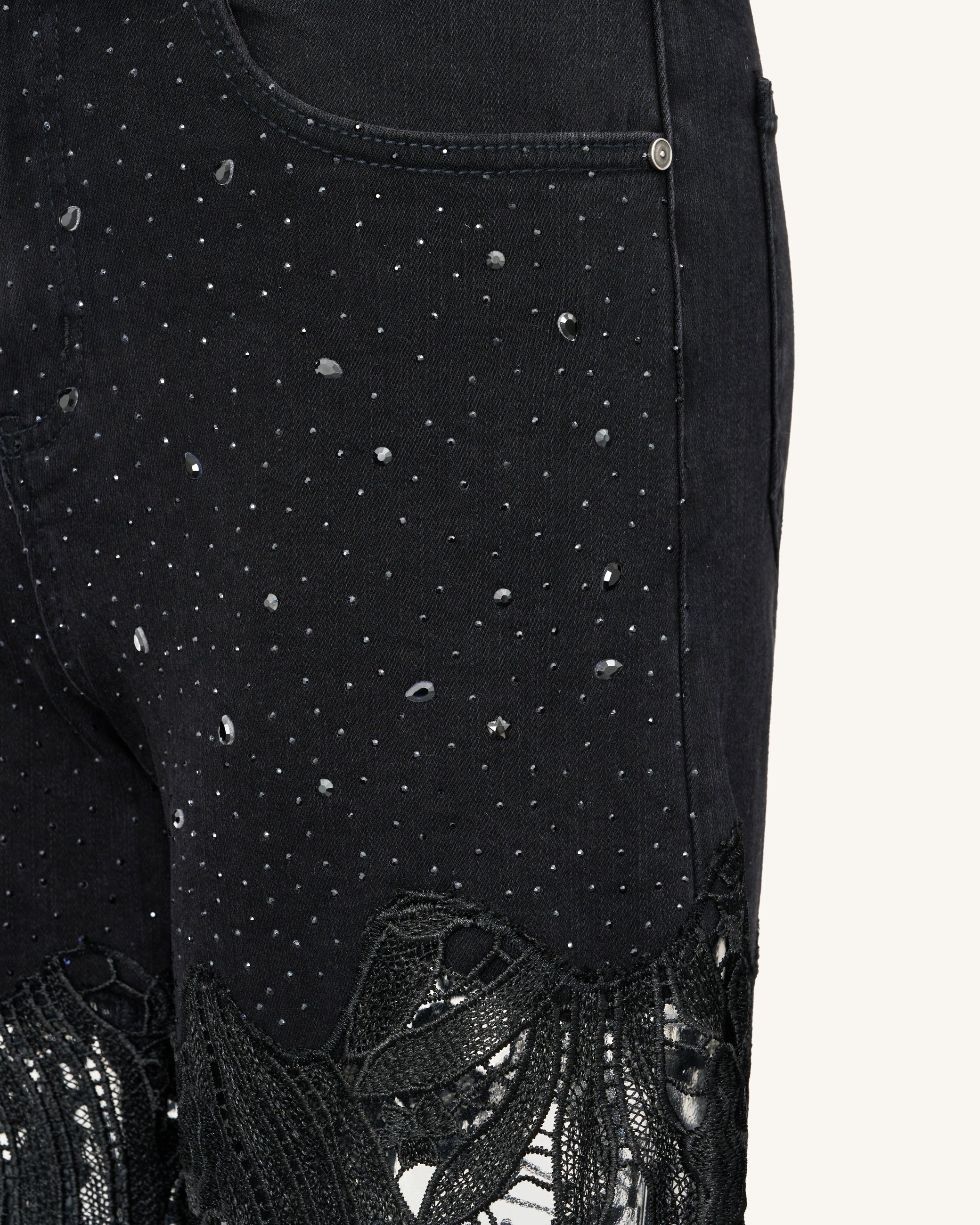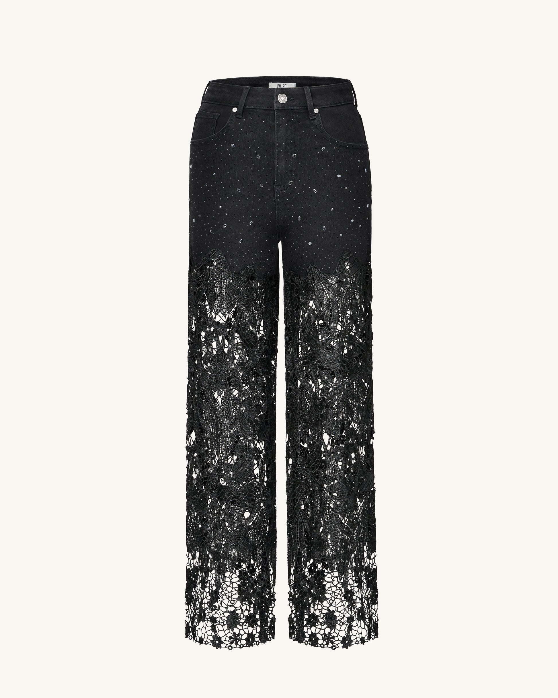 Jean en denim brodé taille haute à jambe large en dentelle avec strass - Noir