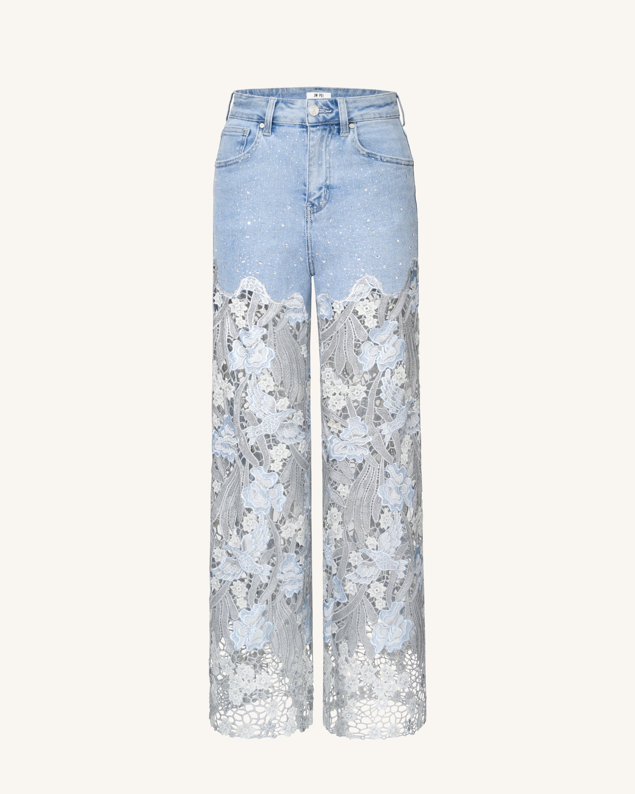 Jean en denim brodé taille haute à jambe large en dentelle avec strass - Bleu clair
