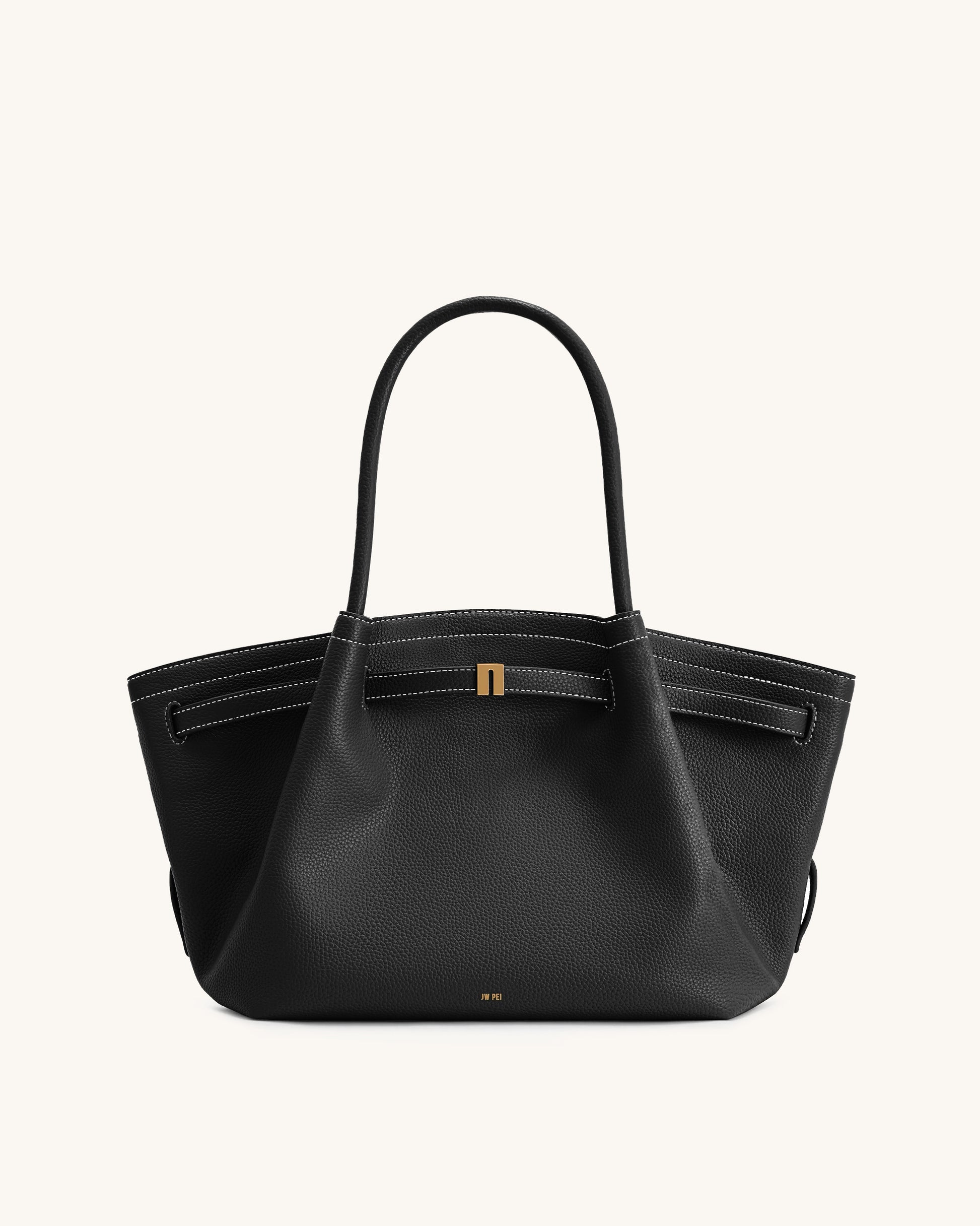 Ce sac cabas trapézoïdal structuré en noir classique présente une texture grainée raffinée et des coutures blanches contrastantes. Conçu avec de longues poignées et une silhouette douce mais sculpturale, il allie élégance et capacité — parfait pour le travail, les courses ou les sorties en ville.