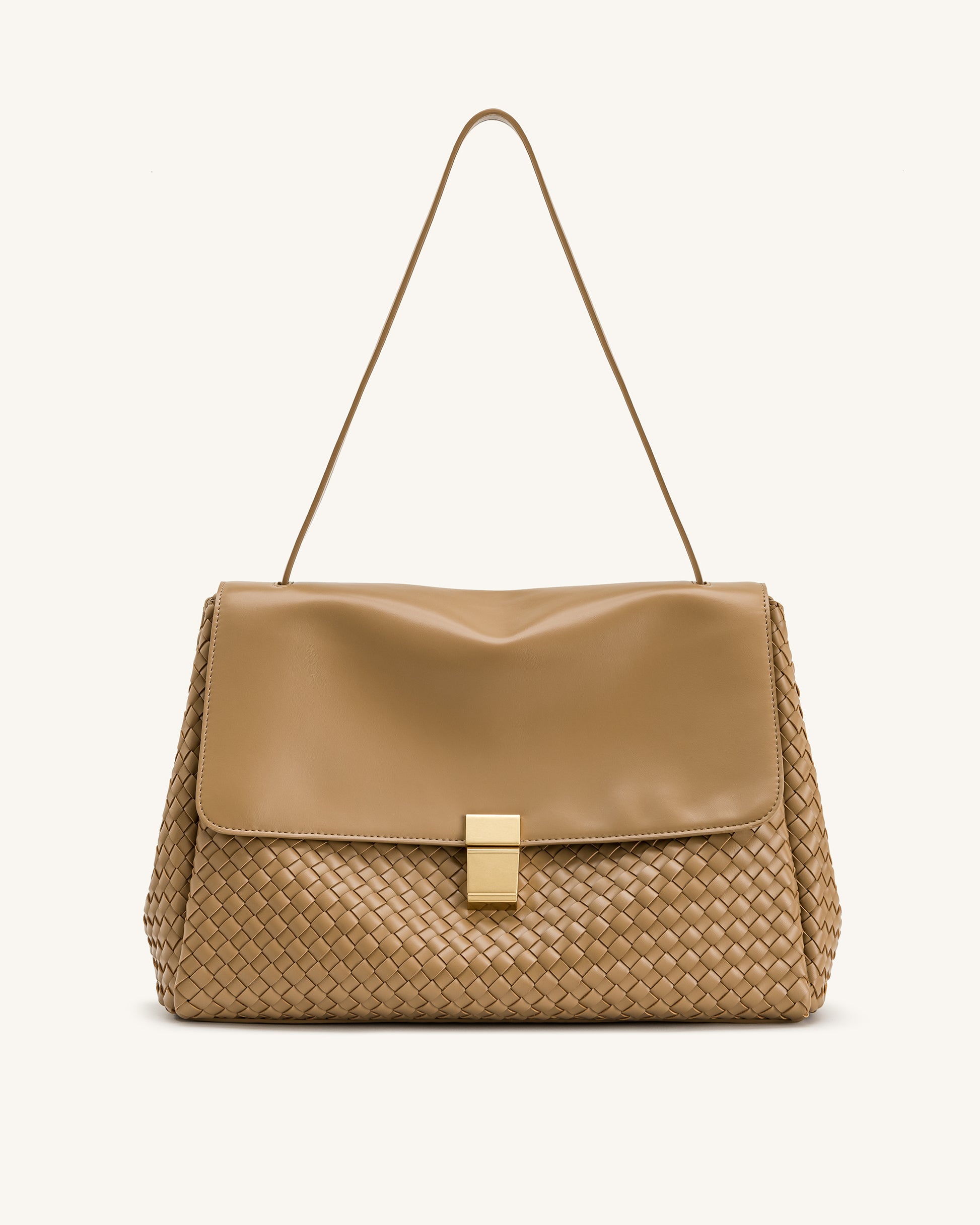 Ce sac à épaule élégant présente un rabat en cuir synthétique doux et une base à texture tissée dans un ton camel chaud. Conçu avec une silhouette structurée, un fermoir doré et une bandoulière fine, il allie raffinement moderne et savoir-faire classique.