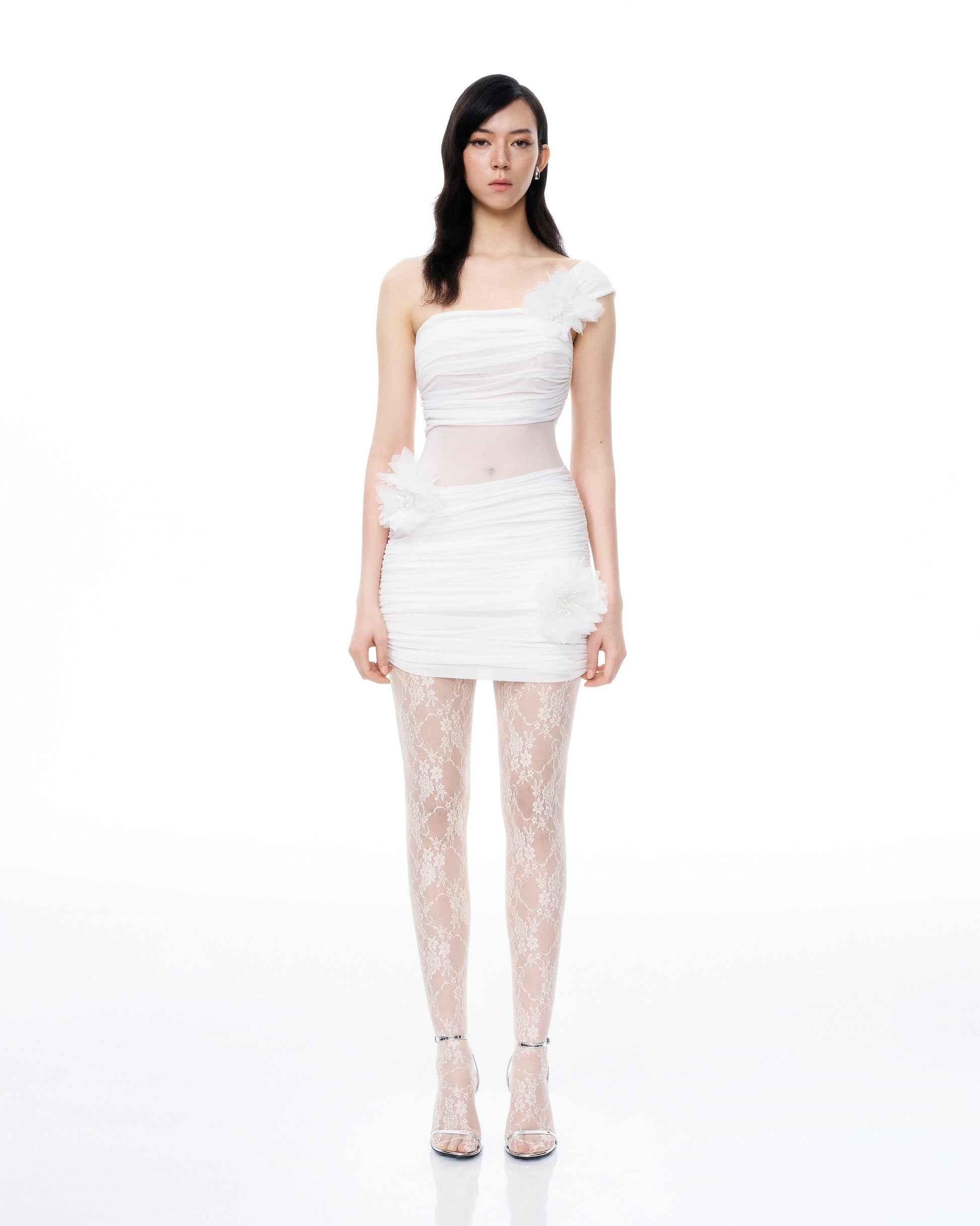 Robe courte Isidore à fleurs 3D et effet froissé – Blanc