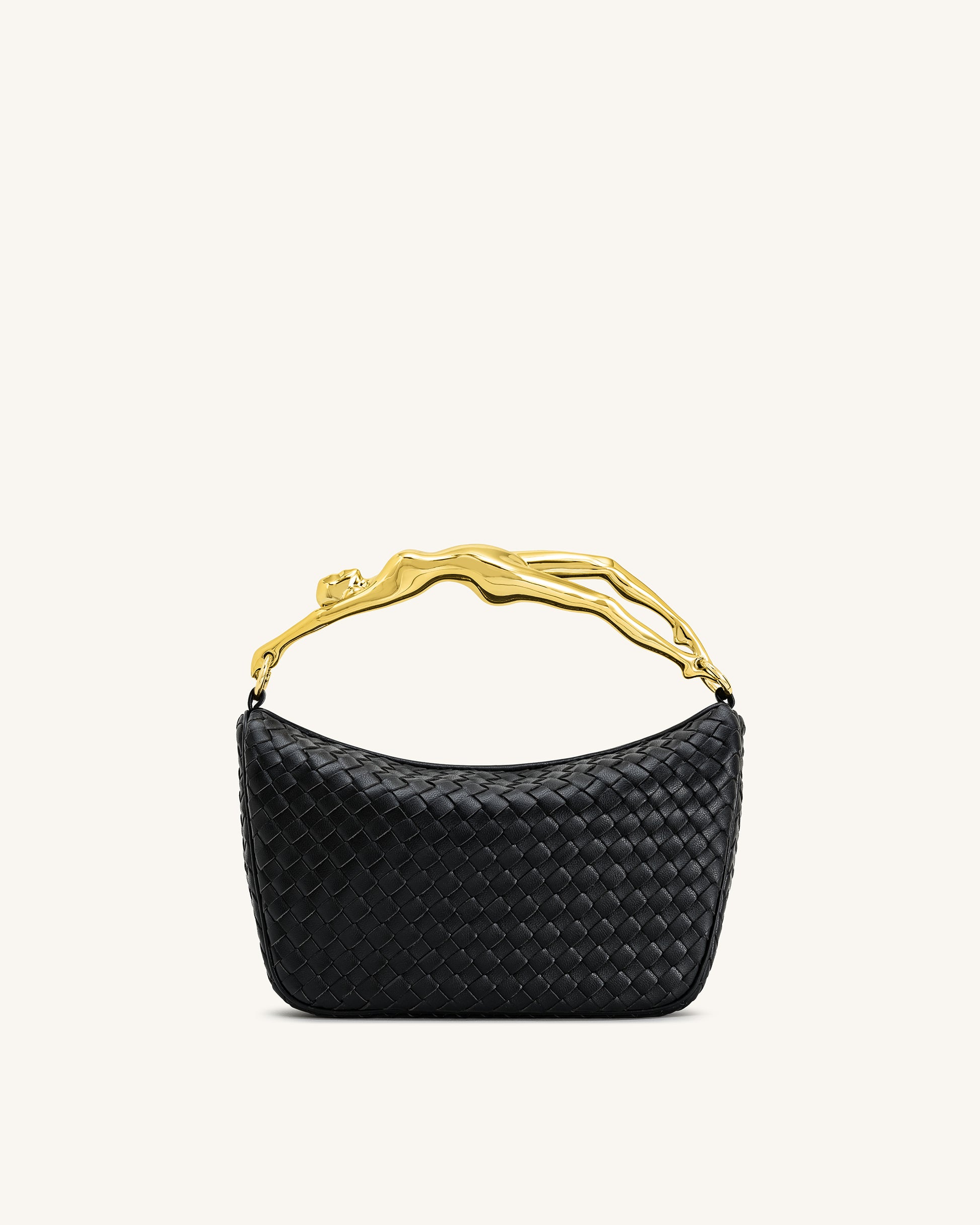 Ce sac à main présente une poignée sculpturale en métal doré en forme de silhouette humaine allongée, associée à un corps tissé noir profond et élégant. Sa silhouette compacte et ses détails raffinés allient une touche artistique à une sophistication moderne, en faisant un accessoire saisissant pour toutes les occasions.