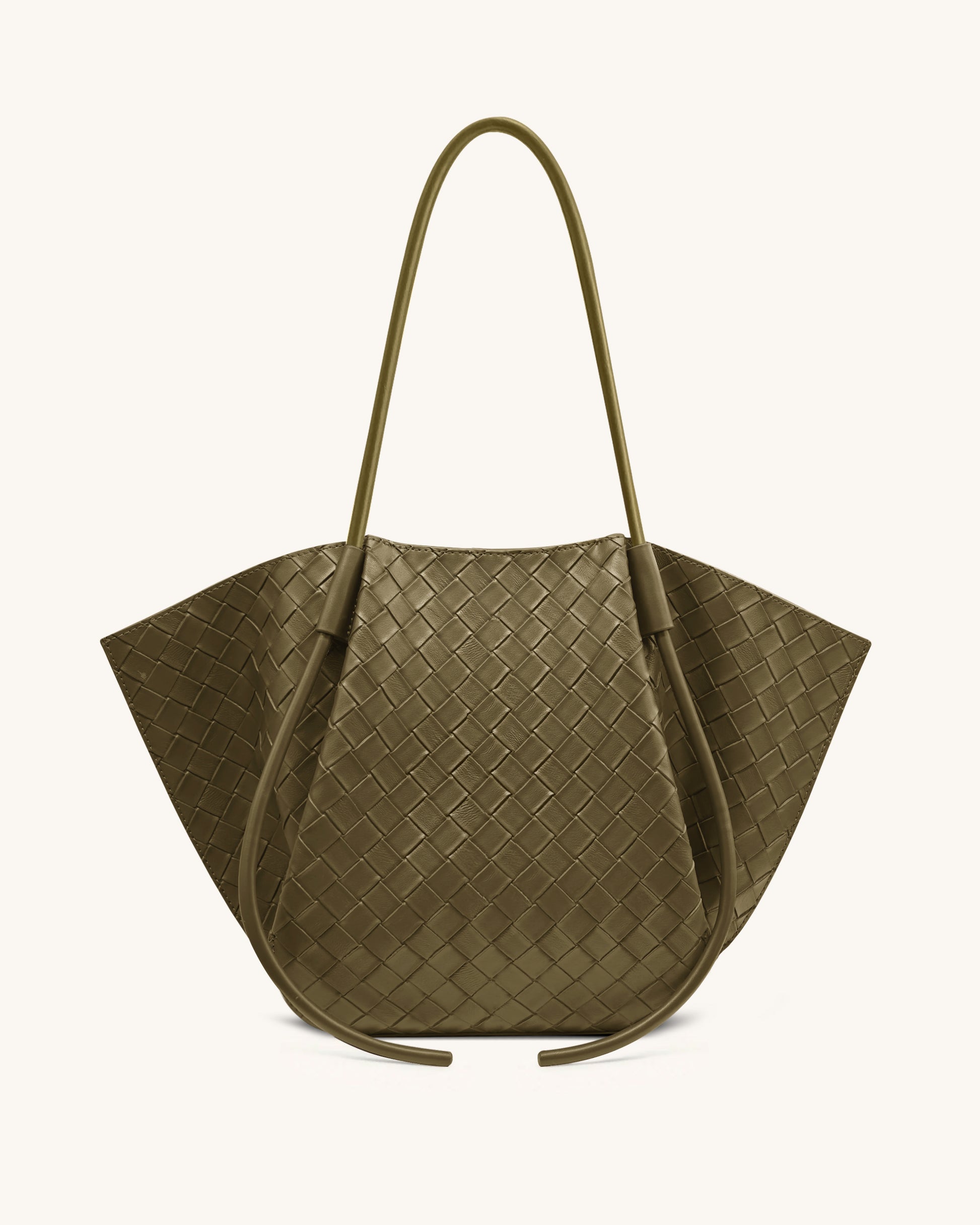 Sac fourretout tissé élégant et pratique en vert olive. Cuir vegan doux avec une silhouette élégante et spacieuse. Doté de longues sangles d'épaule pour un port polyvalent.