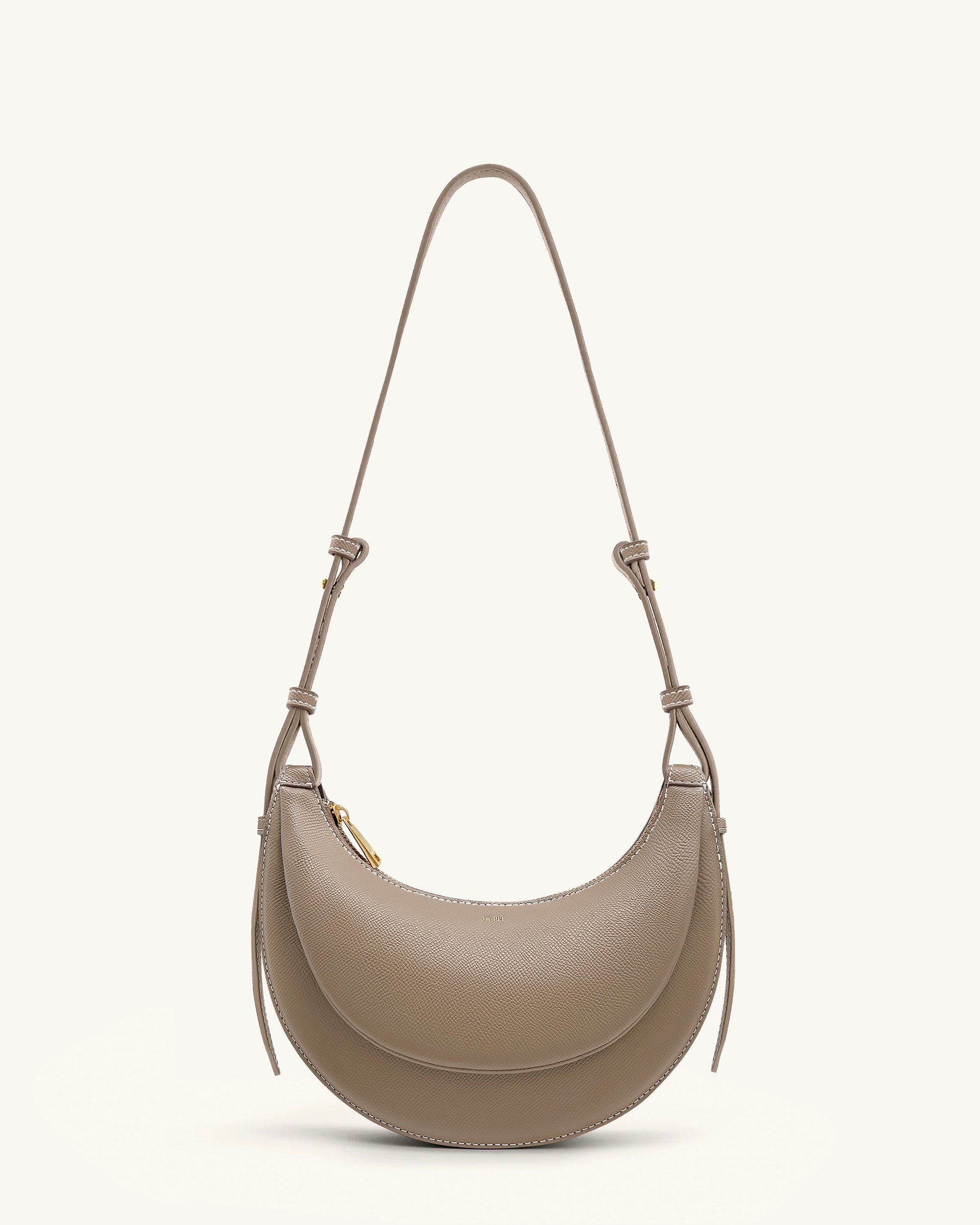 Ce sac en forme de croissant présente du cuir vegan avec une texture grain de palmier. Il est doté d'une fermeture éclair dorée et d'une bandoulière réglable. Une poche intérieure coulissante contient les essentiels. Compatible avec un iPhone 16 Pro Max.
