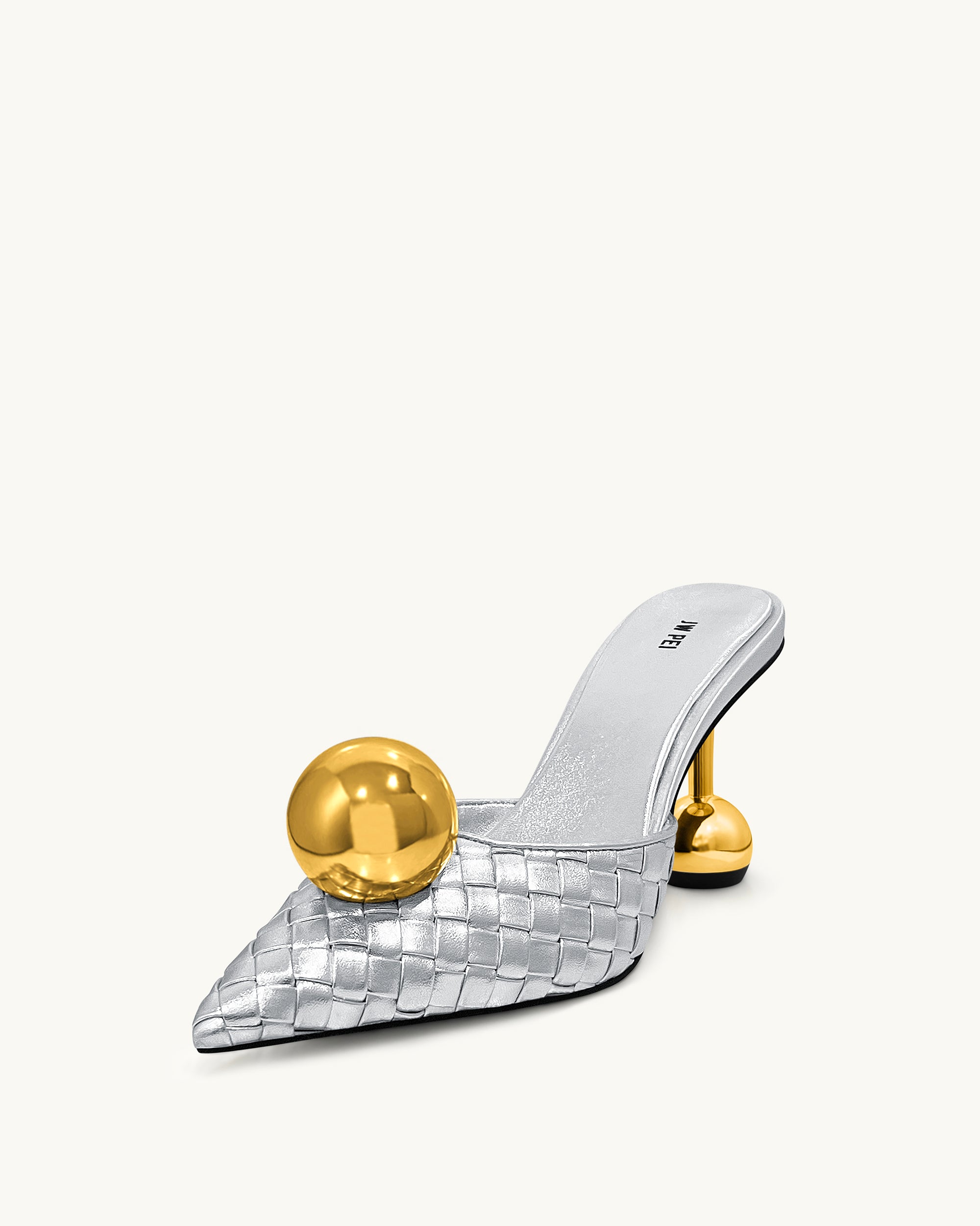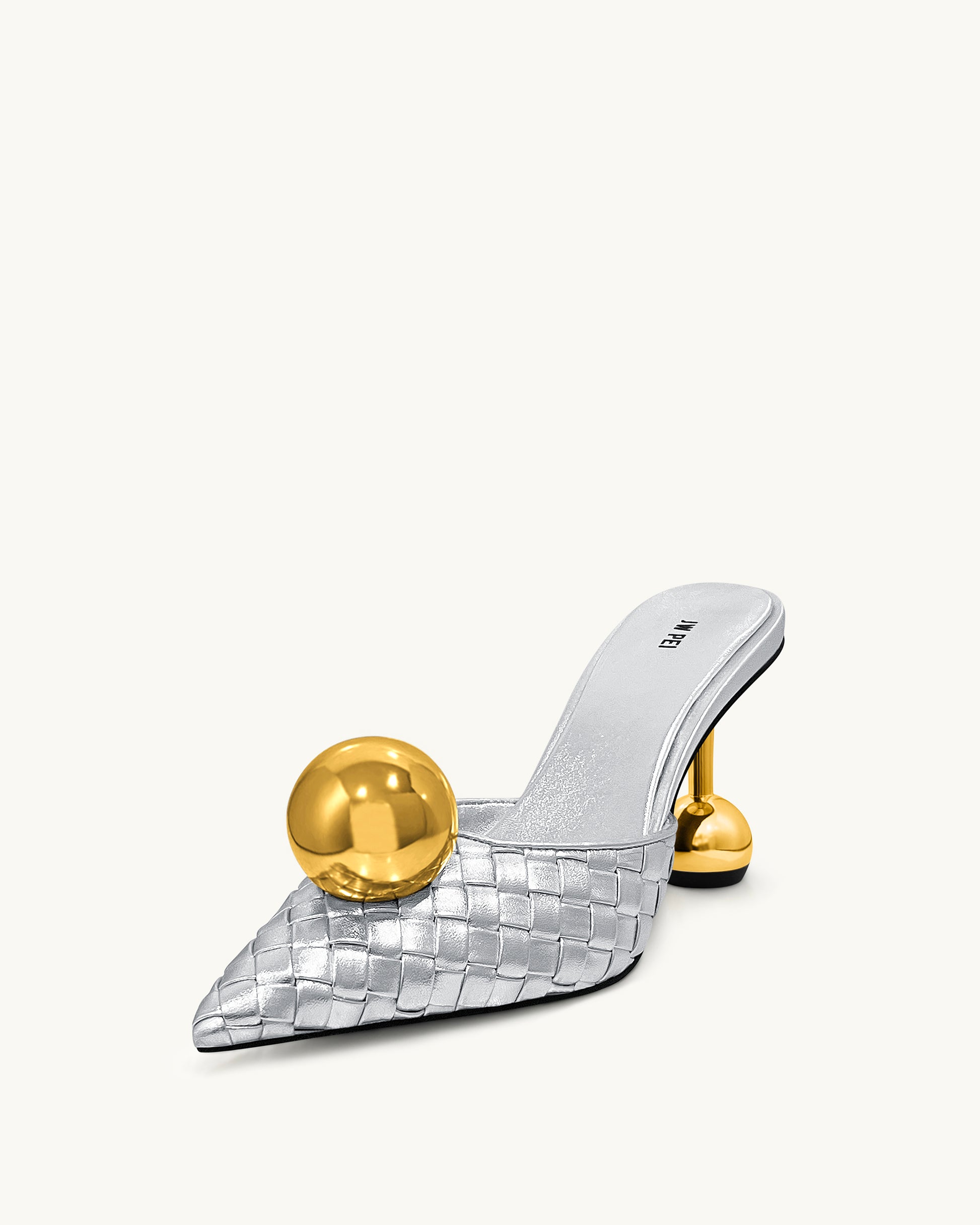 Ces mules à bout pointu présentent une tige tissée en argent métallique, rehaussée d'un accent ovale doré audacieux sur le cou-de-pied et d'un talon sphérique métallique assorti. Le design unique mêle glamour moderne et élégance raffinée, parfait pour se démarquer en toute occasion.