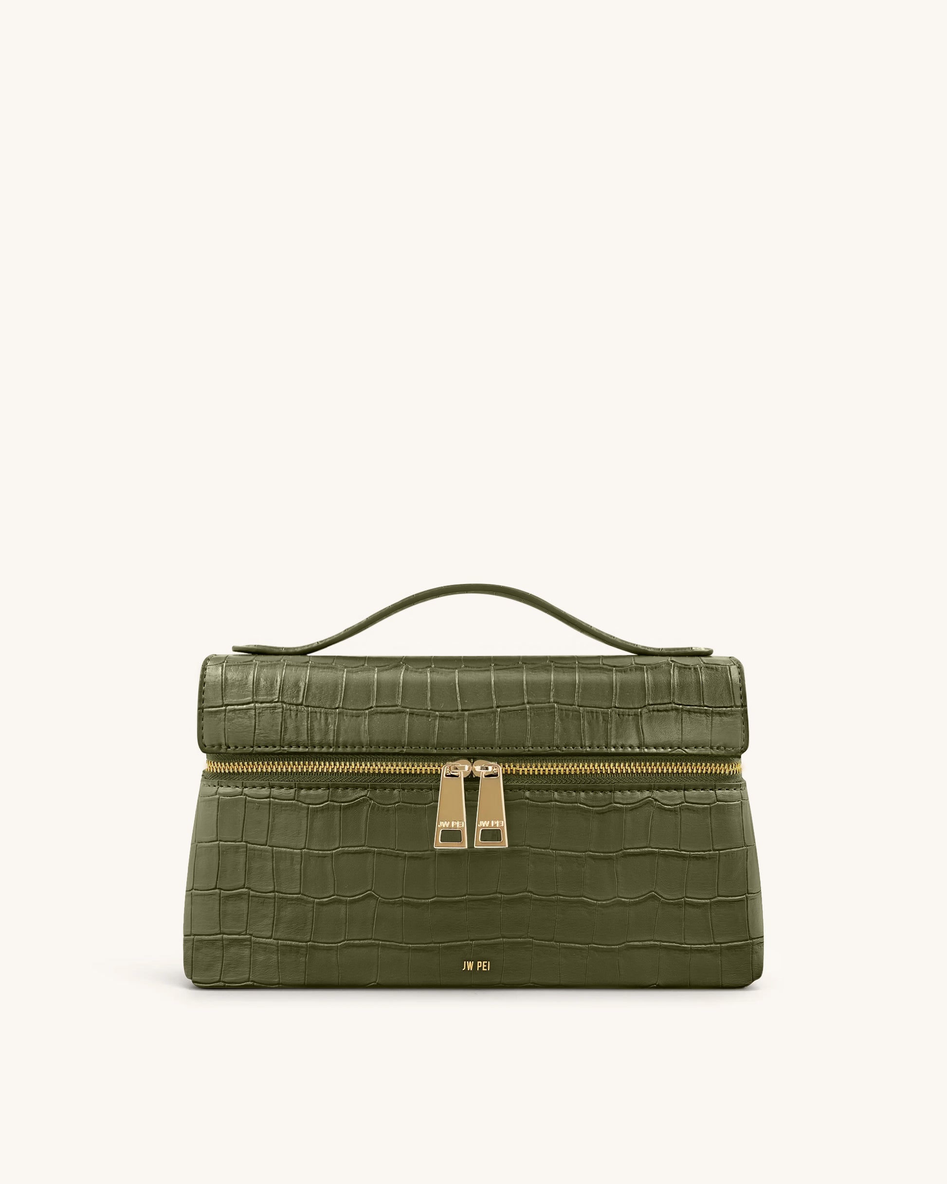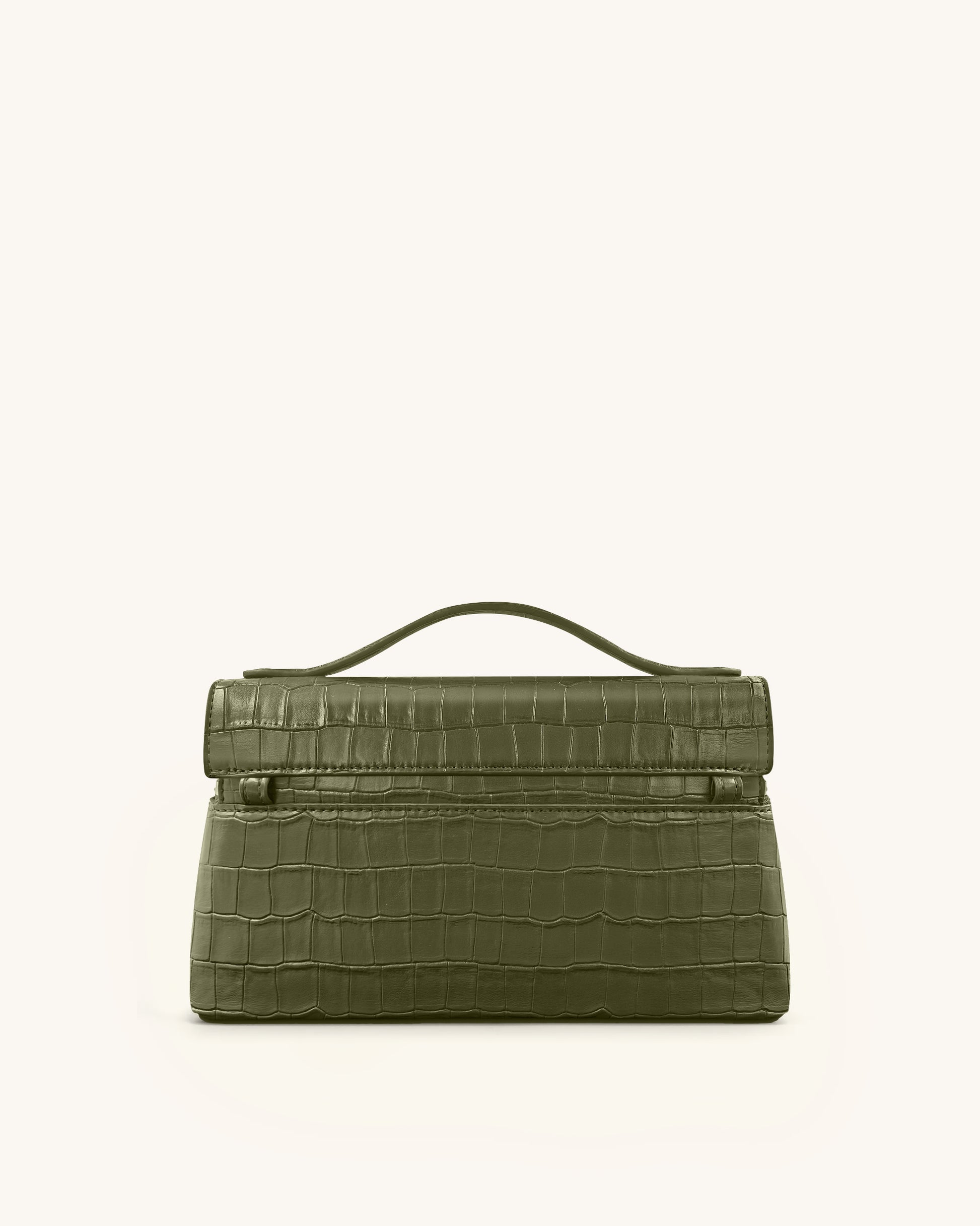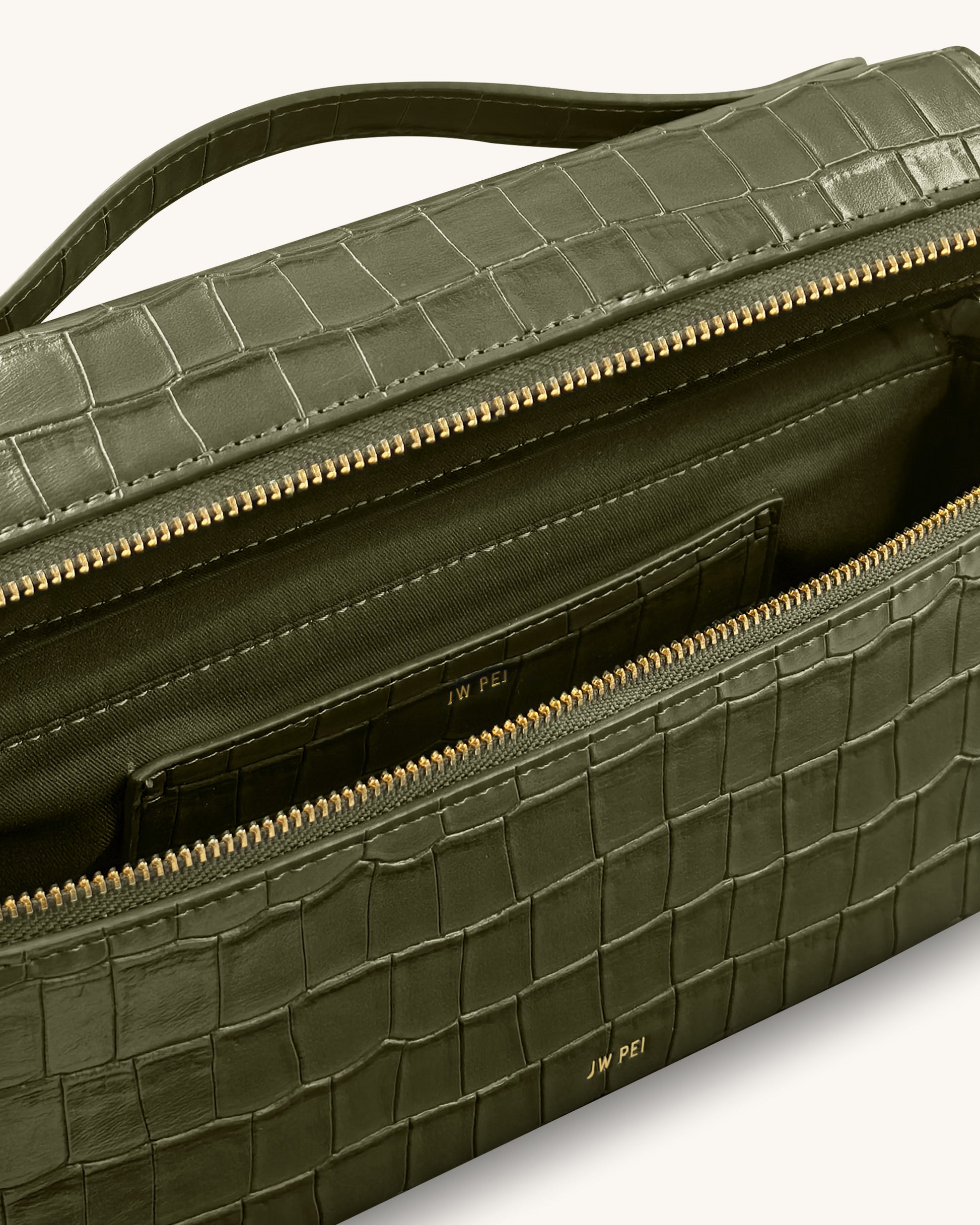 Structuré, tendance et pratique. Confectionné en cuir végétalien embossé crocodile avec des ferrures dorées. Polyvalent : peut se porter à la main ou en bandoulière.